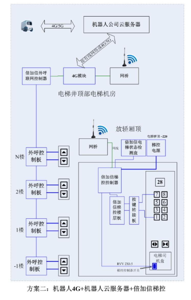 (1)機(jī)器人在電梯外,通個(gè)Wifi或4G網(wǎng)絡(luò)發(fā)送指令給倍加信梯控平臺(tái),倍加信梯控云平臺(tái)收到指令后,將指令發(fā)給倍加信梯控系統(tǒng),倍加信梯控系統(tǒng)自動(dòng)點(diǎn)亮上樓或下樓按鍵,實(shí)現(xiàn)呼梯功能。